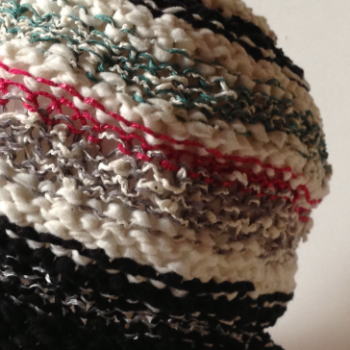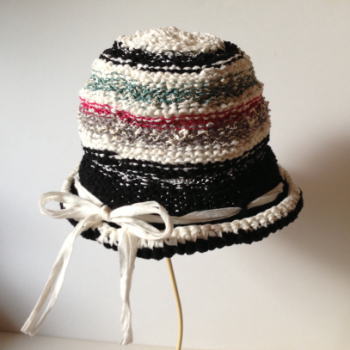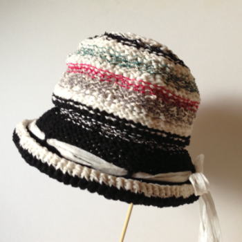 ネルのテープヤーンなど、太さの違う糸をいろいろ使ったクロッシェです。