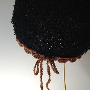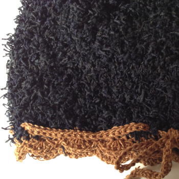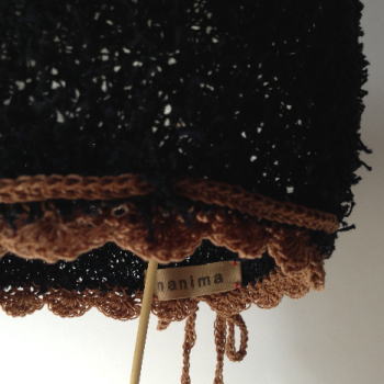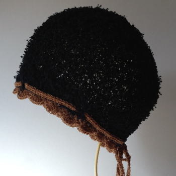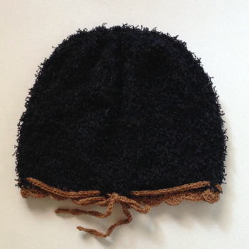 顔周りはフリル風の縁編み、後ろリボン付き。