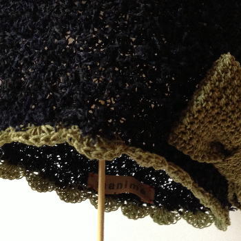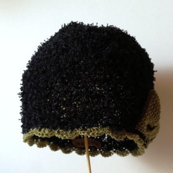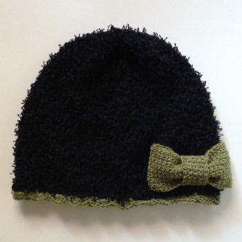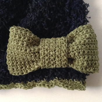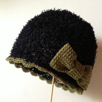 顔周りはフリル風の縁編み、左サイドにリボン。